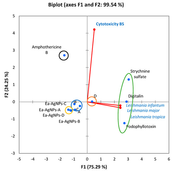 Biplot of the correlations between the products tested and the antileishmanian and cytotoxicity activities.