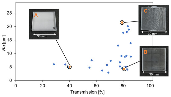 Surface roughness (Ra) as a function of the light transmission for samples printed with different printing speeds, discharge rates and building chamber temperatures. The highlighted samples were printed with the following printing speed, discharge rate and building chamber temperature: A: [20 mm s−1; 80%; 80 °C], B: [40 mm s−1; 80%; 90 °C], C: [60 mm s−1; 80%; 80 °C].