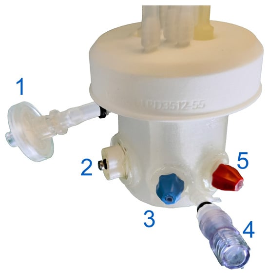 The top plate was manufactured with selective laser sintering (SLS) of polyamide and was based on the commercially available AppliFlex ST bioreactor (Getinge, Gothenburg, Sweden). It featured an internal thread, enabling it to be screwed onto the main body. An airtight seal was ensured with a rubber gasket inserted into the headplate. Before the top plate was screwed on, an LPI-30.7 mixer impeller (Levitronix, Zürich, Switzerland) was placed in the cup at the bottom of the bioreactor. Figure 4 depicts a schematic representation of the fully assembled bioreactor while Figure 5 presents a picture of the final product. Excluding the tubing, the bioreactor is approximately 100 mm tall, and the top plate of the bioreactor has an outer diameter of 75 mm. The vessel has an inner diameter of 51 mm, a wall strength of 1 mm and four baffles, with a width of 4 mm, that protrude 6 mm into the vessel. Measured from the bottom of the vessel, excluding the stirrer cup, the vessel has an internal height of 70 mm, and at its maximum working volume of 90 mL, the liquid level is at 53 mm.