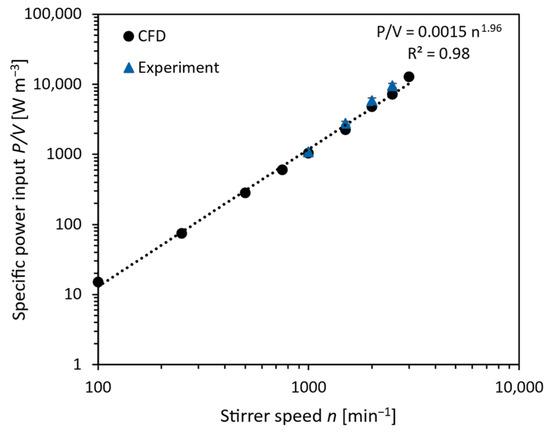 The specific power input is an allometric function of the stirrer speed, which is typical for stirred reactors. The CFD simulations show good agreement with the investigated experimental measurement range (Figure 7).