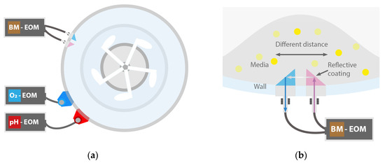 (a) All sensors were attached to separate ports of the vessel. The pH and oxygen electro-optical modules (EOM) were connected to the bioprocess controller while the biomass was connected to a computer. (b) Triangular prisms enabled different path lengths to adjust to different cultures.
