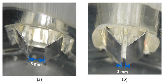 Internal part of optical biomass sensor with a pathway of (a) 5 mm and (b) 1 mm. Aluminum foil was attached to the outer surface of the prisms to improve reflection.