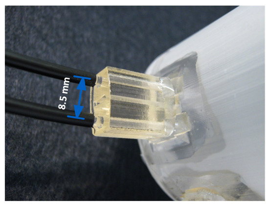 External part of the optical biomass sensor with two installed polymer optical fibers that are spaced 8.5 mm apart.