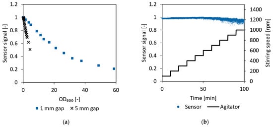 Baker’s yeast suspensions of various concentrations were measured with both optical pathway sizes. As can be seen in Figure 11a, there is a negative correlation between biomass concentration and raw-signal intensity, while the steepness of the sensor response depends on the gap size of the sensor. By changing the gap size, the sensitivity of the biomass sensor can be adjusted to the optical density range of interest, e.g., narrow gap ⇒ low sensitivity ⇒ high measurement range for microbial cultivations and big gap ⇒ high sensitivity ⇒ low measurement range for mammalian cultivations. The stability of the sensor signal under real-life conditions was investigated by measuring a yeast suspension with an OD600 of 10 with a sensor gap size of 1 mm at various stirring speeds ranging from 100 to 1000 rpm. As shown in Figure 11b, the noise level remains acceptable even at high stirring speeds.