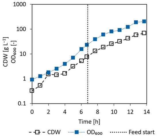 For the E. coli cultivation, the bioreactor was inoculated with an OD600 of 1. A DO spike, which indicates that the substrates are depleted, was detected after 6.7 h. At this point, an OD600 of 23.2 was measured. Subsequently, the exponential feed was initiated and maintained until the process time reached 14 h. The peak CDW and OD600 achieved were 69 g L−1 and 204, respectively, which are somewhat lower than the values attained by Schirmer et al. in a similar process, where a CDW of 86.6 g L−1 and an OD600 of 262 were reported [27]. As depicted in Figure 12, the initiation of feeding causes an inflection point in the cell density curve, as the cell growth changes from one governed by a substrate surplus to glucose limited growth. The average cell specific growth rates were 0.49 h−1 and 0.39 h−1 for the batch- and feed-phase, respectively. The achieved growth rate during the feed-phase was very close to the targeted growth rate of 0.4 h−1.