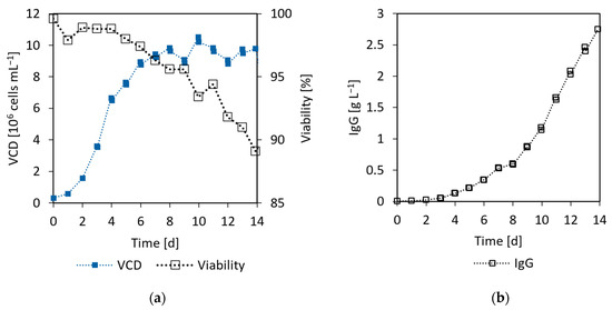 The CHO fed-batch cultivations utilized the ExpiCHO-S 6H8 cell line from Gibco (Thermo Fisher, Waltham, MA, USA), which constitutively express immunoglobulin G (IgG). Unless otherwise stated, the medium and supplements were also sourced from Gibco. The cells were cultivated in Efficient-Pro medium, supplemented with 6 mmol L−1 L-glutamine and 0.1% AntiClumping-Agent, with Efficient-Pro Feed 2 used for feeding.