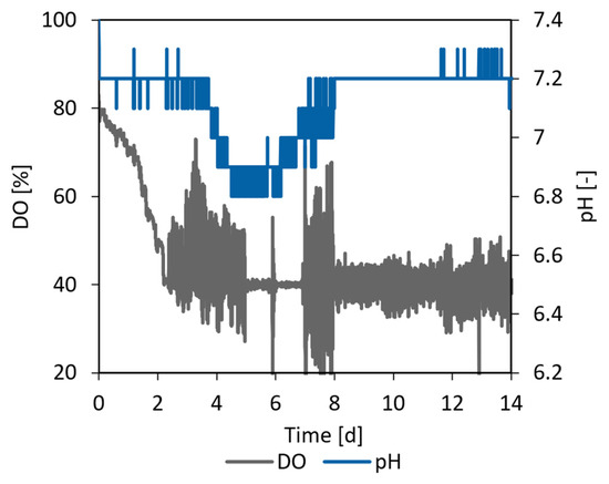 As can be seen in Figure 13, after process hour 11, the cooling capability of the temperature control unit was no longer sufficient to keep the vessel temperature at its setpoint of 37 °C, and the temperature started to rise. A peak temperature of 43.7 °C was recorded at 13.7 h. Subsequent to this peak, a metabolic slowdown induced a temperature reduction, and the process was concluded after the 14th process hour. Throughout the feed-phase, the DO was regulated to 40%. Although this regulation was not optimal, it is anticipated that no oxygen limitation occurred during the cultivation.