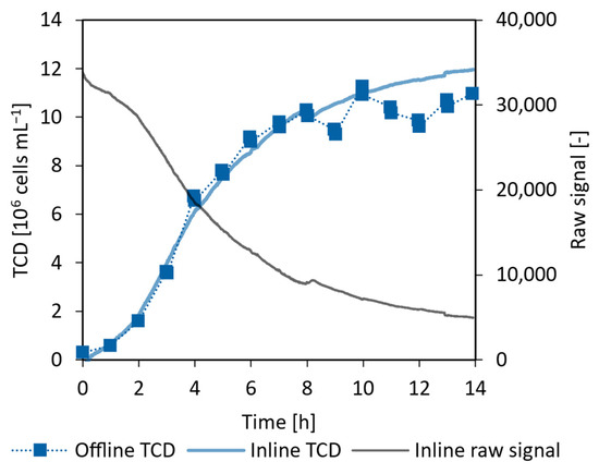 The inline biomass sensor performance can be seen in Figure 15. For the E. coli cultivation, an optical path length of 1 mm was used, and a data point was recorded every second. To filter out noise, a moving average calculation was applied over nine datapoints.