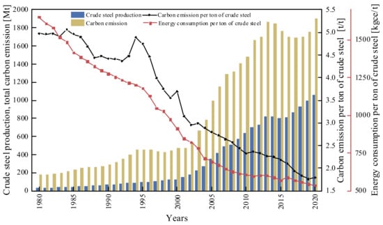 Evolution of crude steel production, carbon emissions, and energy consumption per ton of crude steel in the iron and steel industry of China [14,15].
