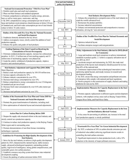 Considering the efforts for energy conservation and emission reduction in the iron and steel industry of China, the evolution of the industry can be divided into three key stages: The formative years from 1949 to 1999, the period of rapid growth spanning 2000 to 2014, and the current phase of maturity and stability since 2015 [14] (Figure 1). Until 2020, the industry had managed to annually reduce comprehensive energy consumption per ton of steel to 545 kgce and carbon emission intensity per ton to 1.79 t [15]. Despite these achievements, the increase in crude steel production posed challenges in reducing the overall carbon emissions growth rate within the industry. As the economy continued to grow, policy directives in the iron and steel sector shifted from guidance and support to stringent measures such as controlling total output, reducing excess capacity, phasing out outdated production facilities, and prioritizing high-quality development within the industry since 2020. China set forth the ambitious dual-carbon goal while introducing more stringent policies that prioritize scientific and technological innovation, coordinated development, intelligent manufacturing, green and low-carbon practices, quality control, and the research and development of high-precision products within the industry [16]. These policies have been incorporated into the overarching framework for achieving carbon peak and carbon neutrality while forming the foundational 1 + N policy system for the dual-carbon efforts of the industry [17]. Figure 2 illustrates the release dates and principal contents of significant policies in the steel industry post-2000.