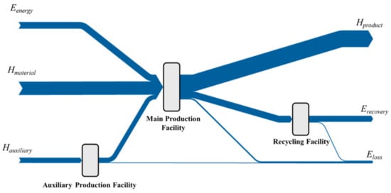 Consequently, the actual energy consumption of the production process equals the disparity between the energy contained in the utilized energy medium and the recovered energy. The second expression can be deduced from the energy–mass balance relationship of the process (Equation (2)), as demonstrated in Equation (3).
