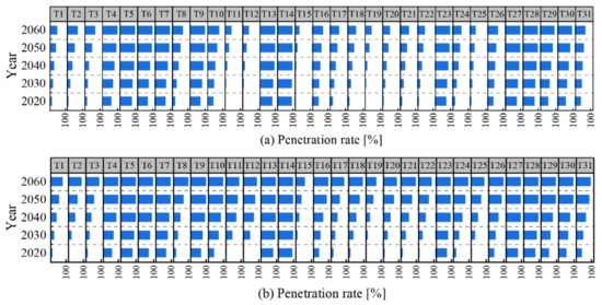 Enhancing energy efficiency is the primary technical approach to curbing carbon emissions in existing production conditions. This study systematically categorized energy efficiency improvement technologies within the steel industry based on their sequential processes. These methods decrease energy consumption by enhancing production conditions, productivity, and energy utilization. Additionally, they elevate energy efficiency by harnessing waste heat and energy reuse. Technical parameters and market penetration data were obtained from the Guide to Advanced and Applicable Technologies for Energy Conservation and Emission Reduction in the Iron and Steel Industry (First Batch) as well as relevant research [15,47,48,49,50]. A comprehensive screening process identified 31 distinct technologies, as listed in Table 5. Under the current baseline scenario, the penetration rate of energy efficiency improvement technologies is expected to increase gradually. However, when the industry confronts stringent environmental constraints, this rate will dramatically increase. Figure 5a,b illustrates the penetration rates of these technologies under the respective scenarios.