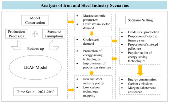 In recent years, numerous models have been developed to understand the dual-carbon pathway of the iron and steel industry. Based on the modeling principles, they can be classified into three categories: Top-down models, bottom-up models, and hybrid models. The top-down models are dominated by computable general equilibrium (CGE). Zhu et al. [7] employed a CGE model to evaluate the economic and environmental impacts of energy-intensive sectors, including cement, iron, steel, and construction. They scrutinized how these impacts influenced the implied carbon emissions of the construction industry. Zhang et al. [8] used a dynamic CGE model to simulate the peak time of carbon emissions in China under two scenarios: Single policy and hybrid policy. It has been found that the hybrid policy has a better emission reduction effect than the single policy, so policy makers should scientifically adjust the carbon tax and carbon trading system to fully utilize the synergistic effect of economy and environment. However, these models mainly analyze energy changes from an economic perspective and cannot start from the technical level, which underestimates the technical potential. The long-range energy alternatives planning system (LEAP) model, on the other hand, as a common bottom-up model, has a detailed portrayal of technologies, ignores a certain degree of sectoral linkages, and analyzes changes in the energy environment in more detail. Duan et al. [9] integrated life-cycle theory into the LEAP model and predicted carbon emissions in the iron and steel industry of Jilin Province. Their study included the energy and ore mining stage to the steel end-of-life recycling stage. The findings revealed that the steel production stage accounted for over 80% of total carbon emissions, with the ironmaking system being the highest emitter within this stage. Ates et al. [10] explored energy efficiency and emission reduction potentials in the Turkish iron and steel industry using the LEAP model. Results indicated significant reductions in energy consumption and GHG emissions through the adoption of energy-saving technologies and enhanced energy system management. The NEMS model developed by the U.S. Department of Energy and the hybrid IIASA-WECE3 model developed by Austria in conjunction with the World Energy Council are complex models that are difficult to manipulate, although they can provide an exhaustive picture of changes in the national energy sector [11]. To assess the economic advantages of diverse energy-saving and emission-reduction measures, Zhang et al. [12] evaluated 35 technologies within the iron and steel industry and constructed energy-saving supply curves. Dong et al. [13] introduced a logarithmic form of marginal emission reduction cost function to analyze the emission reduction costs and potentials of various technologies while fostering the low-carbon transformation of the iron and steel industry.
