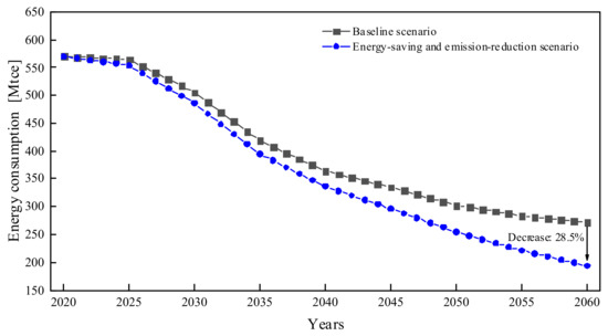 Figure 7 illustrates the energy consumption trend in the iron and steel industry of China from 2020 to 2060. In 2020, the energy consumption of the industry stood at 570 Mtce. Both energy consumption and crude steel production exhibit a consistent decline. Under the baseline scenario, crude steel production will experience gradual growth until 2025. However, due to the increased adoption of electric furnace steelmaking and the implementation of energy-efficiency improvement technologies, the industry achieved peak energy consumption in 2020. The consumption will slowly decrease to 564.69 Mtce in 2025 and to 271.09 Mtce in 2060. The energy-saving and emission-reduction scenario, driven by the accelerated promotion of production processes and energy-efficiency improvement technologies, results in more significant declines in energy consumption, reaching 271.09 Mtce in 2060. By 2025, energy consumption will reduce significantly, totaling 193.93 Mtce in 2060, marking a 28.5% decrease from the baseline scenario. In 2060, energy consumption per ton of steel will be 408.9 kgce and 292.5 kgce, respectively. It is crucial to note that crude steel output significantly influences energy consumption fluctuations. Assuming a crude steel output of 1.09 billion tons in 2025, total energy consumption in the iron and steel industry will continue an upward trend even in the baseline scenario. Therefore, curbing the disorderly growth of crude steel production is of priority.