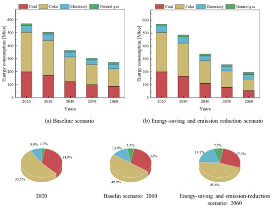 The primary energy inputs for the steel industry include coal, coke, natural gas, electricity, hydrogen, gasoline, and diesel. A simplification is conducted to neglect the conversion of hydrogen, gasoline, and diesel to standard coal since their ratio in the primary energy inputs is small. As these values exhibit minimal changes across different scenarios, they are excluded from the sub-category of energy consumption. Figure 8 illustrates the alterations in the main energy sources from 2020 to 2060. The findings reveal coal and the predominant share of coke, constituting approximately 90% of total energy consumption in the baseline year. The shift in energy source distribution in the baseline scenario is marginal, which will stay at 87%, 85%, 85%, and 86% from 2030 to 2060, respectively. The share of coal could diminish slightly, reaching 87.4%, 85.8%, 84.2%, and 81.7% from 2030 to 2060. Under the energy-saving and emission reduction scenario, coal-based energy could significantly decrease, comprising 86.7%, 84.3%, 80.3%, and 72.9% from 2030 to 2060. This decline could result from a higher proportion of short-process steelmaking, leading to a significant rise in electricity consumption from 8.9% in 2020 to 19.1% in 2060. The future environmentally friendly and low-carbon progression of the iron and steel industry of China hinges on steel electrification levels and the degree of decarbonization of the electrical industry. These approaches fundamentally curtail reliance on coal-based energy, either through the development of all-scrap short processes or direct iron reduction through water.