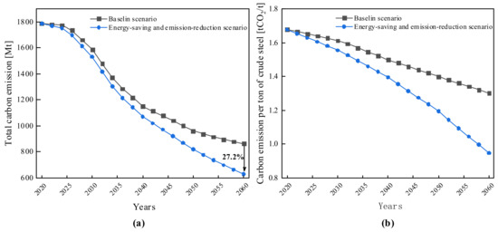 Changes in (a) total carbon emission and (b) carbon emission per ton of steel from 2020 to 2060.