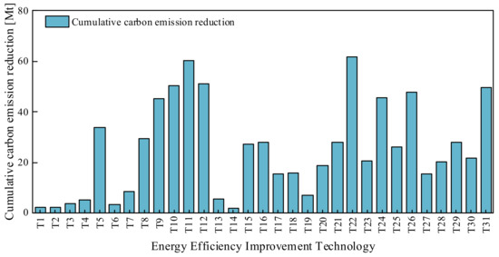 Figure 11 illustrates the cumulative emission reductions resulting from 31 energy efficiency improvement technologies, which have a total emission reduction potential of 780 Mt under the energy efficiency improvement scenario. The coking process yields the smallest cumulative emission reductions. This is primarily due to the limited consideration of coke-making plants within the iron and steel enterprises of the model, resulting in a lower activity level compared to other processes. Technologies in the blast furnace process offer slightly higher cumulative emission reductions than other processes. High-efficiency coal injection in the blast furnace, dehumidification blast technology, and double preheating of flue gas in the hot blast furnace all contribute to cumulative emission reductions of over 50 Mt. Market penetration significantly influences cumulative emission reductions. For instance, technologies such as dry residual pressure power generation from the blast furnace roof gas and gas recovery from the blast furnace for T13 and T14 exhibit lower cumulative emission reductions. Other technologies demonstrate varied cumulative emission reductions based on their penetration rate, inherent energy saving, and emission reduction potential. Energy efficiency improvement technologies applied to converters, electric furnaces, and rolling processes also offer substantial opportunities for emission reductions.