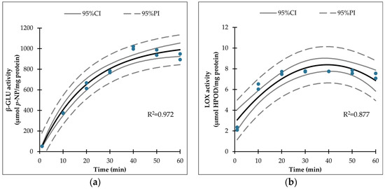 Nonlinear regression models for the activity of enzymes over time at 25 °C: (a) β-GLU—one phase association exponential function; (b) LOX—polynomial second-order function. The black line represents the model curve, the gray full line represents the 95% confidence interval, and the gray dashed line represents the 95% prediction interval. The circles represent plot-level data points.