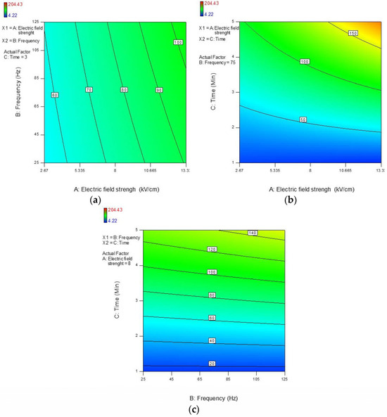 Response Surface Methodology (RSM) was used to determine the influence of independent factors on β-GLU and LOX activity immediately after PEF treatment and after an additional 30 min incubation at 25 °C. The results for the observed dependent variables based on full factorial design were used to build regression models that included linear and interaction coefficients because none of the quadratic terms were considered significant. Models were evaluated based on lack of fit and coefficients of determination (R2). Factorial ANOVA was used to determine the influence of PEF parameters on the obtained results. Nonlinear modeling and one-way ANOVA were performed in XLSTAT 2023 software (Lumivero, Denver, CO, USA), while Design Expert 10 (Stat-Ease, Inc., Minneapolis, MN, USA) was used for RSM.