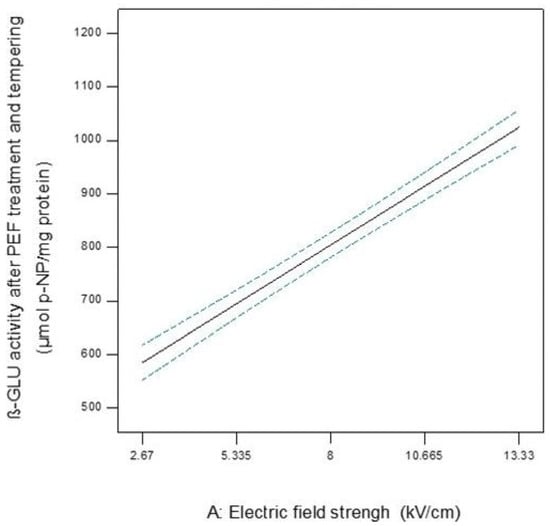 The activity of β-GLU after additional incubation can also be described by a linear three-factor model without factor interactions. The model parameters listed in Table 2 show that, of the three parameters studied, only electric field strength had a significant effect on the final concentration of p-NP. These results are consistent with the results of Tukey’s test (Table 1) and can be explained by the fact that conformational changes on the enzyme caused by a stronger electric field (13.33 kV/cm) increased the activity of the enzyme. The maximum product concentration in these samples was reached sometime during the 30 min incubation period, making the time of the PEF treatment insignificant. The effect of electric field strength, as the only significant factor, on β-GLU activity after additional incubation of the model solutions is shown in Figure 4.