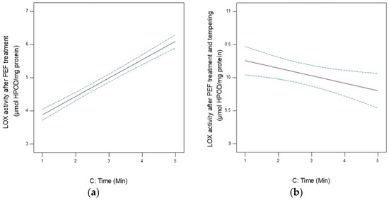 The influence of time, the only significant factor in the activity of LOX both immediately after PEF treatment and after additional incubation of the samples, is shown in Figure 5. Treatment time had a positive effect on the activity of LOX immediately after PEF treatment (Figure 5a). However, after the incubation period, the opposite effect was observed (Figure 5b). This is probably due to the spontaneous decomposition of the formed hydroperoxides, which was more pronounced with time [26].