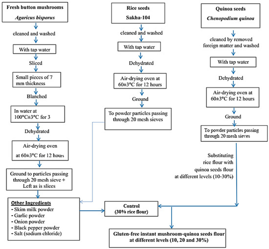 The fresh, edible white mushrooms (Agaricus bisporus) of the button variety, quinoa seeds (Chenopodium quinoa Willd.), and rice seeds (Oryza sativa) of the Sakha-104 variety were obtained from the Agriculture Research Center in Giza, Egypt. The skimmed milk powder, garlic powder, onion powder, black pepper powder, and salt were bought from the local market in Cairo, Egypt. Chemicals and analytical-grade reagents were used in the study. They were obtained from El-Gamhouria Trading Chemicals and Drugs Company in Cairo, Egypt.