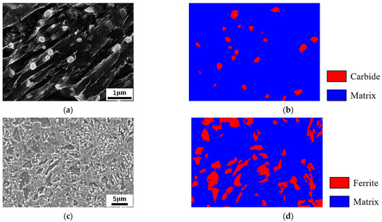 To develop training guidelines for the segmentation of different material organizational forms in SEM images of steel, we collected 90 images of Fe-0.2C-1.35Mn-2.5Cr-1.5Si alloy subjected to different heat treatments. The data were divided into two parts: 64 high-magnification (20,000×) SEM images of carbide precipitation and 26 ordinary (5000×) SEM images of ferrite, martensite, and residual carbides. Both parts underwent austenitizing, tempering, and annealing, but the former had a shorter tempering time. To account for the differences in quantity and texture between the two parts, we separated them into two datasets: the carbide dataset with categories of carbide and matrix, and the ferrite dataset with categories of ferrite and matrix (martensite and residual carbide). A materials science expert labeled the two datasets, as shown in Figure 2.