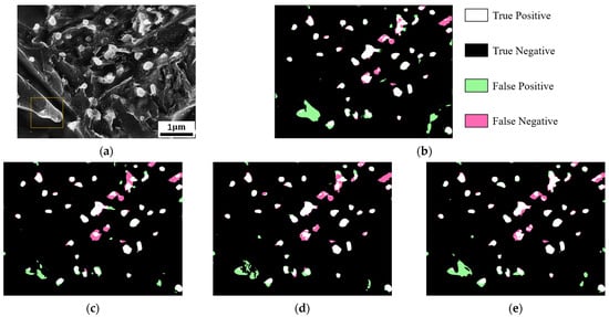 Segmentation results of DeepLabV3Plus for the carbide dataset. (a) The original input image. (b) The segmentation image of the baseline training program. (c–e) The segmentation images after applying the techniques of transfer learning, strong data augmentation, and receptive field enlargement, respectively. White pixels indicate true positive predictions, black pixels indicate true negative predictions, green pixels indicate false positive predictions, and pink pixels indicate false negative predictions.
