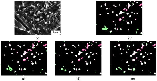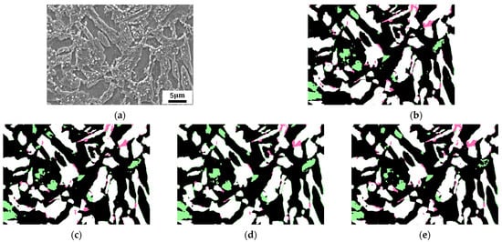 Segmentation results of PSPNet for the carbide dataset. (a) The original input image. (b) The segmentation image of the baseline training program. (c–e) The segmentation images after applying the techniques of transfer learning, strong data augmentation, and receptive field enlargement, respectively. The color scheme is consistent with Figure 3.