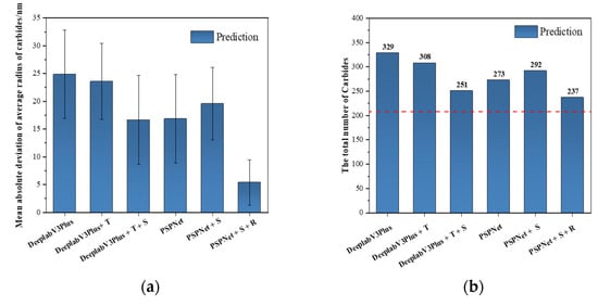 We used segmentation models to quantify the carbides in the test set. As shown in Figure 7, the established models (DeepLabV3Plus and PSPNet) with the highest mIoU values outperformed other models in terms of quantitative accuracy. The established PSPNet model achieved the lowest error with strong data augmentation and receptive field enlargement. The predicted total carbide number and average carbide radius differed from the actual values by 29 and 5.39 nm, respectively.