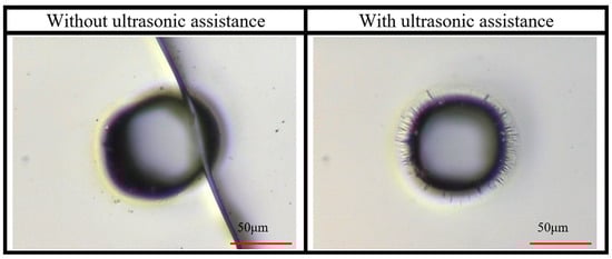 - Elhami, S.; Razfar, M.R. Effect of Ultrasonic Vibration on the Single Discharge of Electrochemical Discharge Machining. Mater. Manuf. Process. 2018, 33, 444–451. [Google Scholar] [CrossRef]