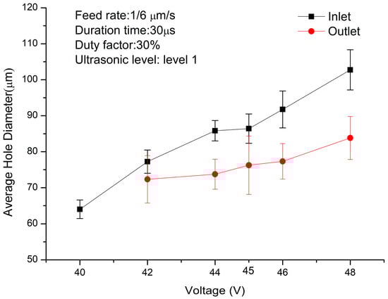 - In the ultrasonic vibration-assisted ECDM, the average inlet and outlet diameters can be increased simultaneously by increasing the working voltage. A high working voltage accelerates the bubble formation, a thick insulating gas film is formed, and the discharge energy is increased, resulting in a large hole enlargement;