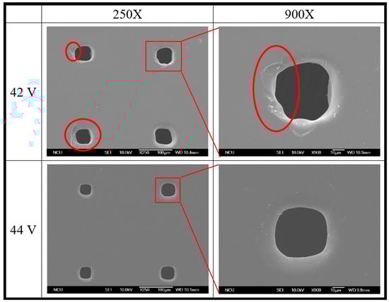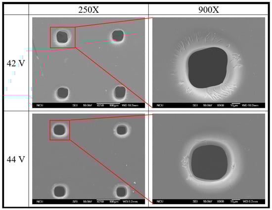 3.2.1. Effect of Working Voltage on Electrochemical Discharge Array Micro-Hole Machining