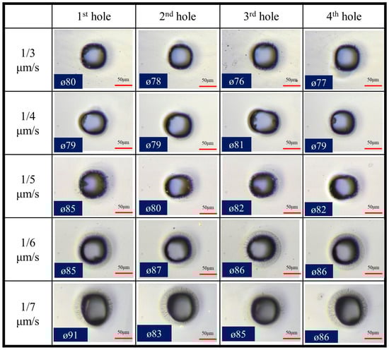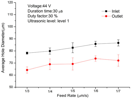 - The average inlet and outlet diameters increase with the decrease in feed rate because at a low feed rate, the total processing time is relatively long, and the lateral discharging time is increased, resulting in a large amount of array micro-hole enlargement;
