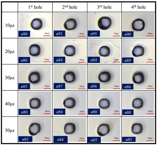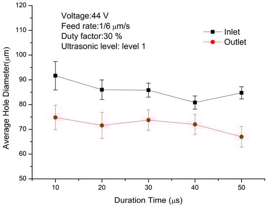 - A short duration of time forms a thick insulating gas film. In order to break through the thick insulating gas film, a high discharge energy is required, resulting in a large hole enlargement. Therefore, under different duration times, the average inlet and outlet diameters are increased as the duration time shortens;
