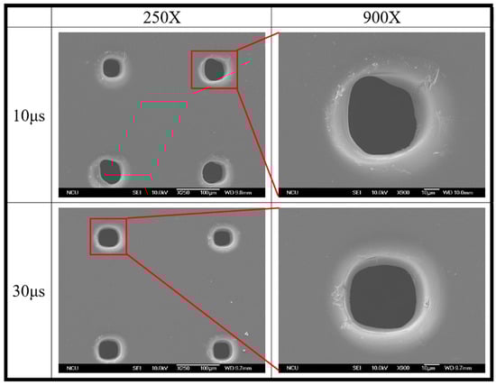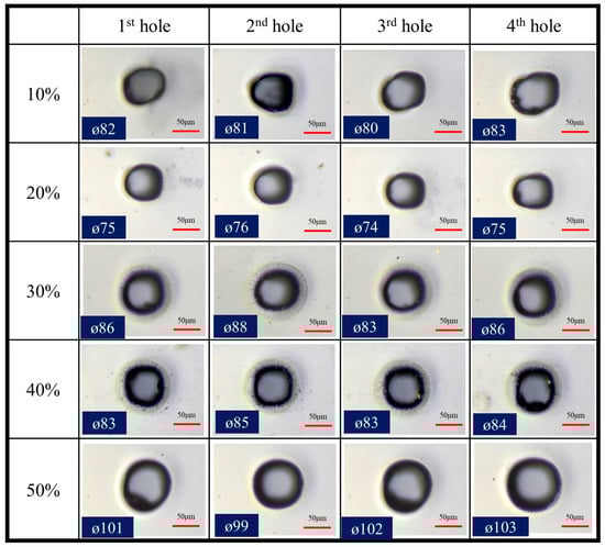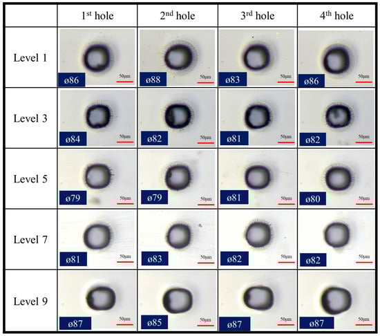 - According to the experimental results, the better parameter combination in this study comprises a working voltage of 44 V, feed rate of 1 µm/6 sec, duration time of 30 µs, duty factor of 30%, and ultrasonic power Level 1, and the average inlet and outlet diameters meet the target dimensional accuracy of 80 ± 8 µm. The average inlet diameter is 85.8 µm, and the average outlet diameter is 73.8 µm. There is no outlet fragmentation, and the morphology of the array micro-holes is better.