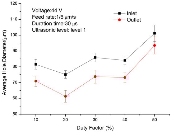 - If the pulse-on time is too short and the pulse-off time is long, there is no time to form a dense insulating gas film, and the bubbles are likely to separate and accumulate at the upper edge of the front end of the tool electrode. Hence, the lateral discharge is increased, resulting in a large hole enlargement. Therefore, under different duty factors, the average inlet and outlet diameters are increased with the duty factor decreasing;