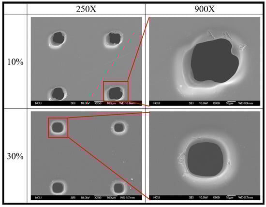 3.2.5. Effect of Ultrasonic Power Level on Electrochemical Discharge Array Micro-Hole Machining