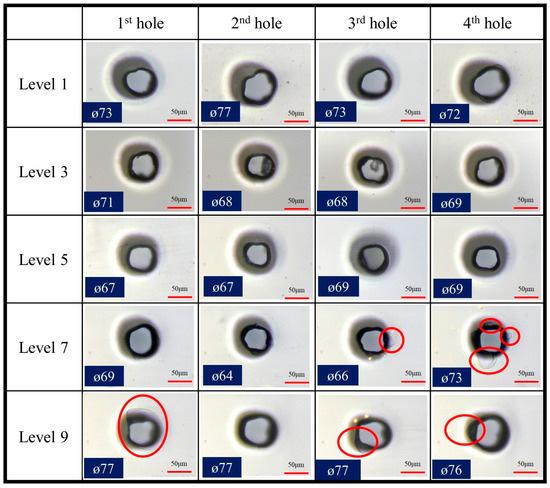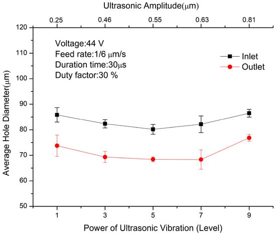 - Under different ultrasonic power levels, the average inlet and outlet diameters are decreased and then increased as the ultrasonic power level increases because the ultrasonic vibration can thin the insulating gas film, but the excessive ultrasonic amplitude excessively disturbs the insulating gas film, resulting in a large hole enlargement;