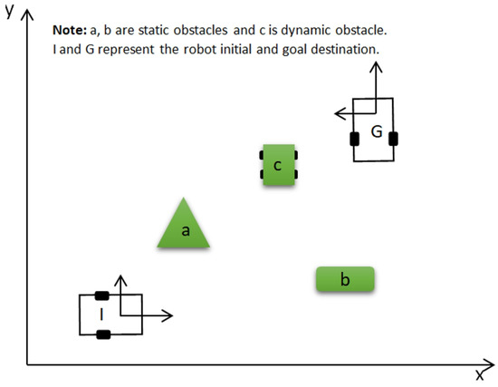 In [75] studied the problem of motion planning and control in the presence of uncertainty for a wheeled mobile robot subject to state and actuator constraints that follow a predetermined path inside an environment with moving obstacles, as shown in Figure 3. The difficulty of motion planning with moving objects in an uncertain environment was overcome. The robot’s mobility must be as close to a nominal velocity profile as is practical in time. The control law parameters must impose as minimal restriction as possible on the ranges of motion. The recommended method may be applied online and is efficient from a computing standpoint. A tough simulation instance was used to demonstrate the method’s potential. In [76] first presented sampling-based robot motion planning for WMRs. It was emphasized that the creation of WMR motion planning algorithms will make them more useful in real-world settings and a variety of circumstances. They ultimately offered concepts that can be executed almost exactly as-is on a platform for actual mobile robots. For a WMR that is described using second-order dynamics, [77] took up the problem of temporal logic motion planning. These temporal logic specifications can capture more complex specifications like sequencing and obstacle avoidance in addition to more common control specifications like reachability and invariance. Three fundamental steps were engaged in their investigation. Due to a control rule they initially developed, the dynamic model may adhere to a more straightforward kinematic model with a globally bounded inaccuracy. Second, it offers a robust definition of temporal logic that takes into consideration the tracking errors from the preceding stage. Finally, they developed a robust temporal logic path-planning problem for the kinematic model using automata theory and simple local vector fields. For WMR route planning, [78] applied unique repulsive potential functions and potential field techniques. In doing so, they addressed the problem of goals being unreachable with close obstacles. Based on multilayered cellular automata, in [79] developed the reactive path-planning method for a non-homonymic mobile robot. They came up with the algorithm that offers the shortest steering radius, the best course, and more fluid trajectories that do not stop and turn regularly. Also, they developed a technique based on the directed (anisotropic) propagation of attractive and repulsive potential. Their method finds all the ideal, collision-free pathways that follow the shortest valley of a hypothetical, embedded hypersurface in 4D space, built under the given constraints.