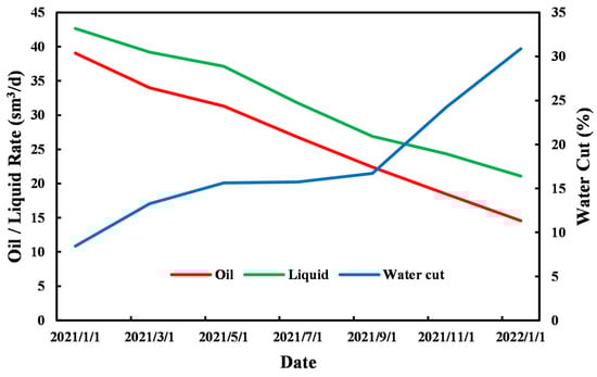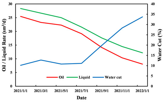 For oil reservoirs implementing N2 injection development, N2 breakthrough occurred before water cut increased. This was primarily due to the superior N2 permeability compared to crude oil. Following N2 breakthrough, there was a decline in oil production. If the oil field maintained a steady production of a certain liquid volume daily, then with a decrease in crude oil production, the water cut would rise (Figure 17).