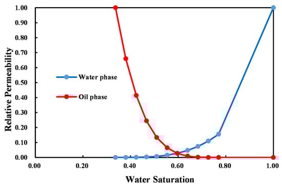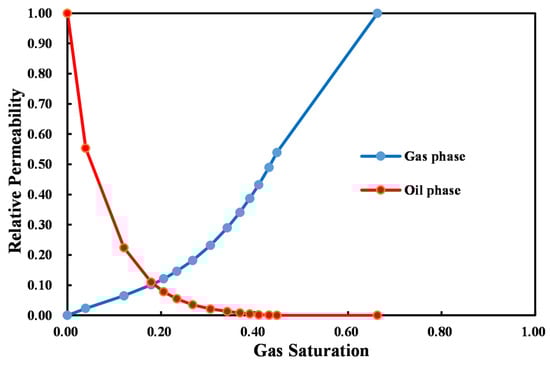 A mechanistic model was established according to the actual geological parameters of Reservoir A, with a grid size of 10 m × 10 m × 10 m, a porosity of 18.2%, a permeability of 12.28 mD, an initial oil saturation of 50%, and an initial average reservoir pressure of 41 MPa. The relative permeability characteristics of oil–water and oil–gas were measured with experiments (Figure 3 and Figure 4).