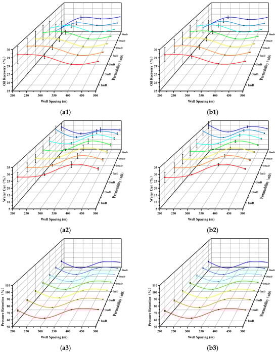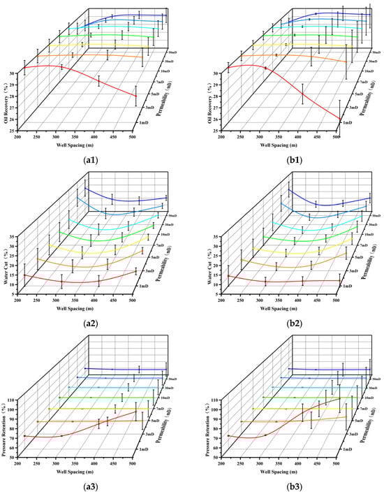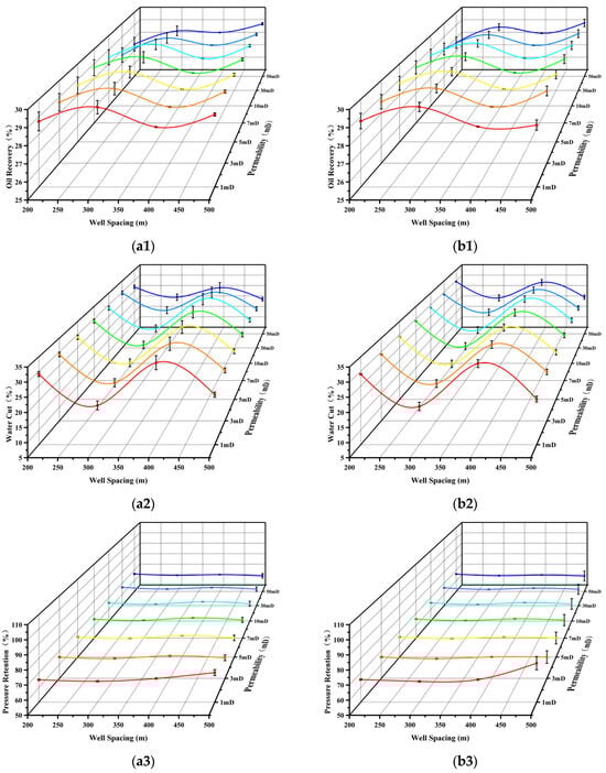 Development performance of an inverted nine-spot well pattern. (a1) Oil recovery at an oil production rate of 2%; (a2) water cut at an oil production rate of 2%; (a3) reservoir pressure maintenance level at an oil production rate of 2%; (b1) oil recovery at an oil production rate of 3%; (b2) water cut at an oil production rate of 3%; (b3) reservoir pressure maintenance level at an oil production rate of 3%. Different colored lines indicate the results (oil recovery, water cut, pressure retention) that can be achieved by using an inverted nine-spot with different well spacing under different permeability conditions.