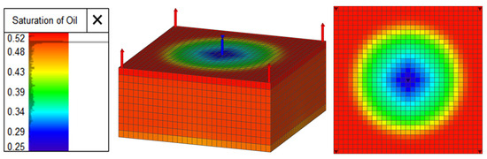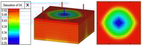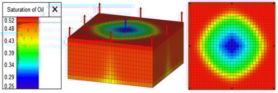 The schematic diagrams of the well patterns illustrate the oil–water distribution after 15 years of production at a 300 m × 300 m area with a permeability of 10 mD (Figure 8, Figure 9 and Figure 10). The water flooding sweep effect of the five-point well pattern was the best. The water flooding direction of the inverted nine-spot and the inverted nine-spot pattern mainly pointed to the area where the reservoir pressure dropped obviously, and the sweep effect was lower than that of the five-point pattern.