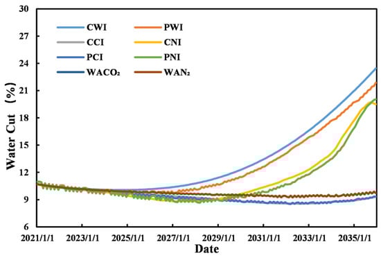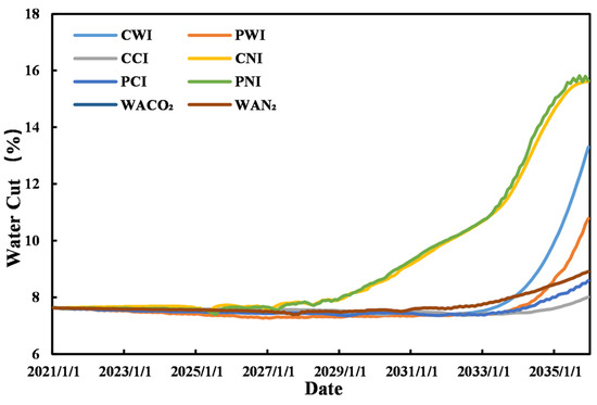 Comparison of water cut in eight schemes (abbreviations in Section 2.3).