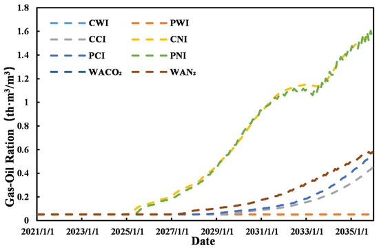 Comparison of gas–oil ratio in eight schemes (abbreviations in Section 2.3).