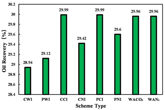 Comparison of oil recovery in actual reservoir schemes (abbreviations in Section 2.3).