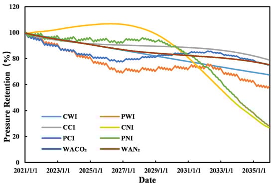 In terms of pressure maintenance, water flooding exhibited a distinct advantage over N2 flooding in the mid-to-late development stages (Figure 18). As for the water–gas alternating schemes, both water-CO2 alternating and water-N2 alternating exhibited positive effects on development and were more cost-effective compared to gas injection. Taking into account factors such as the oil recovery, water cut, reservoir pressure maintenance, and economic benefit, water–gas alternating schemes were suitable for both homogeneous and heterogeneous reservoirs.