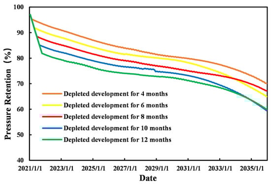Due to the pressure condition of Reservoir A and economic benefit, simulations were conducted for depletion development periods of 4 months, 6 months, 8 months, 10 months, and 12 months in the target reservoir. From the simulation results, it is evident that the 8-month depletion development scheme obtained the highest oil recovery and the lowest water cut (Figure 19) and maintained reservoir pressure at a relatively high level (Figure 20). After 8 months of depleted development, the reservoir pressure coefficient was about 1.09.