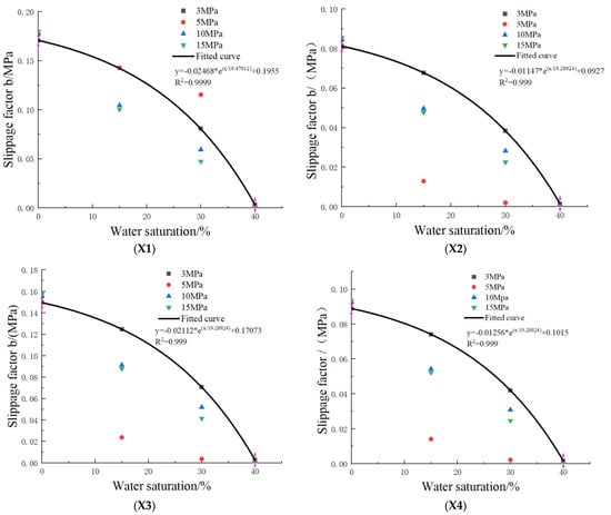 The data from Figure 1 (X1–X4) clearly demonstrate that as the water saturation of the rock samples increases, the slip factor gradually decreases. This indicates that with the increasing water saturation of the rock samples, the gas slip effect diminishes progressively, and at a water saturation of 40%, the gas slip effect is almost completely inhibited.